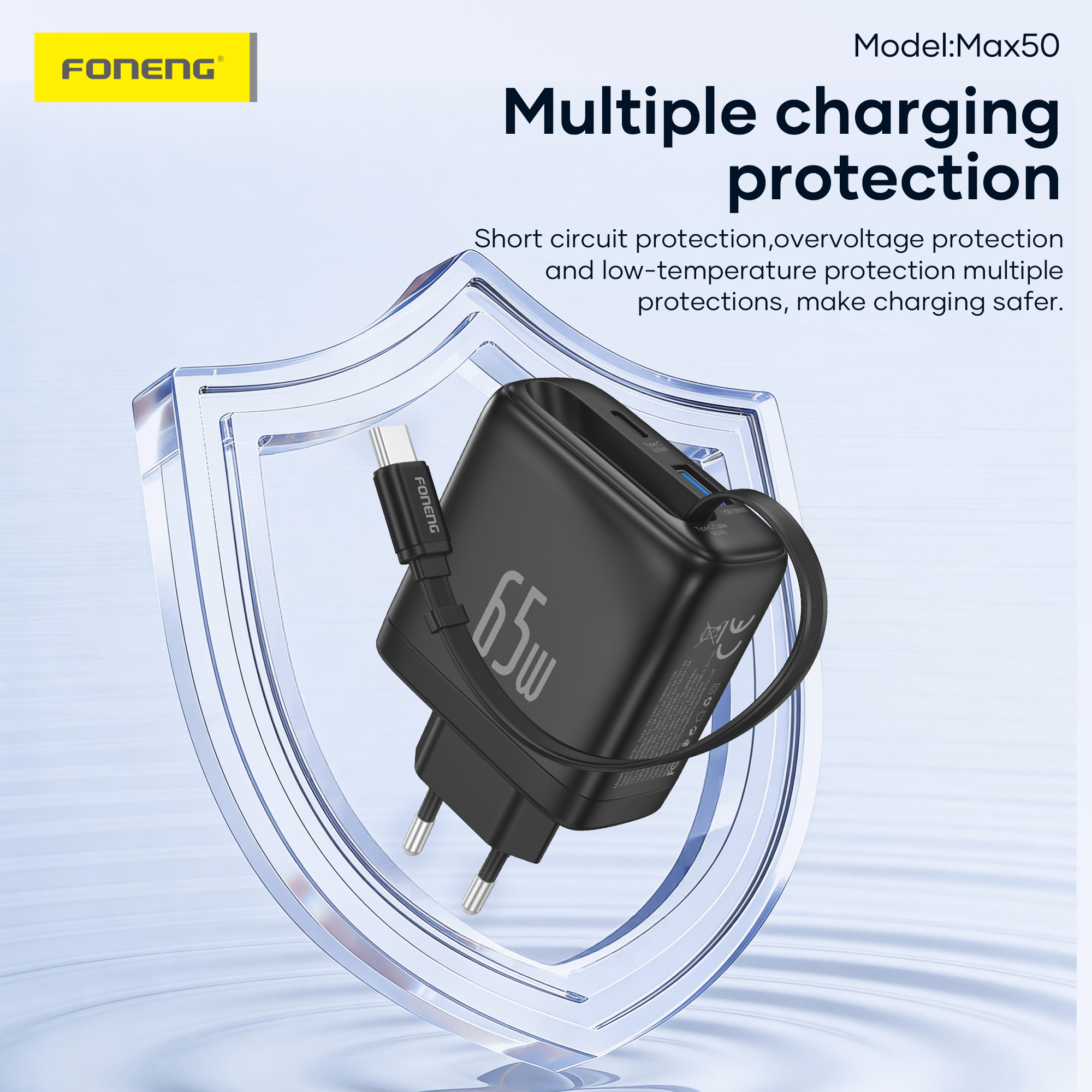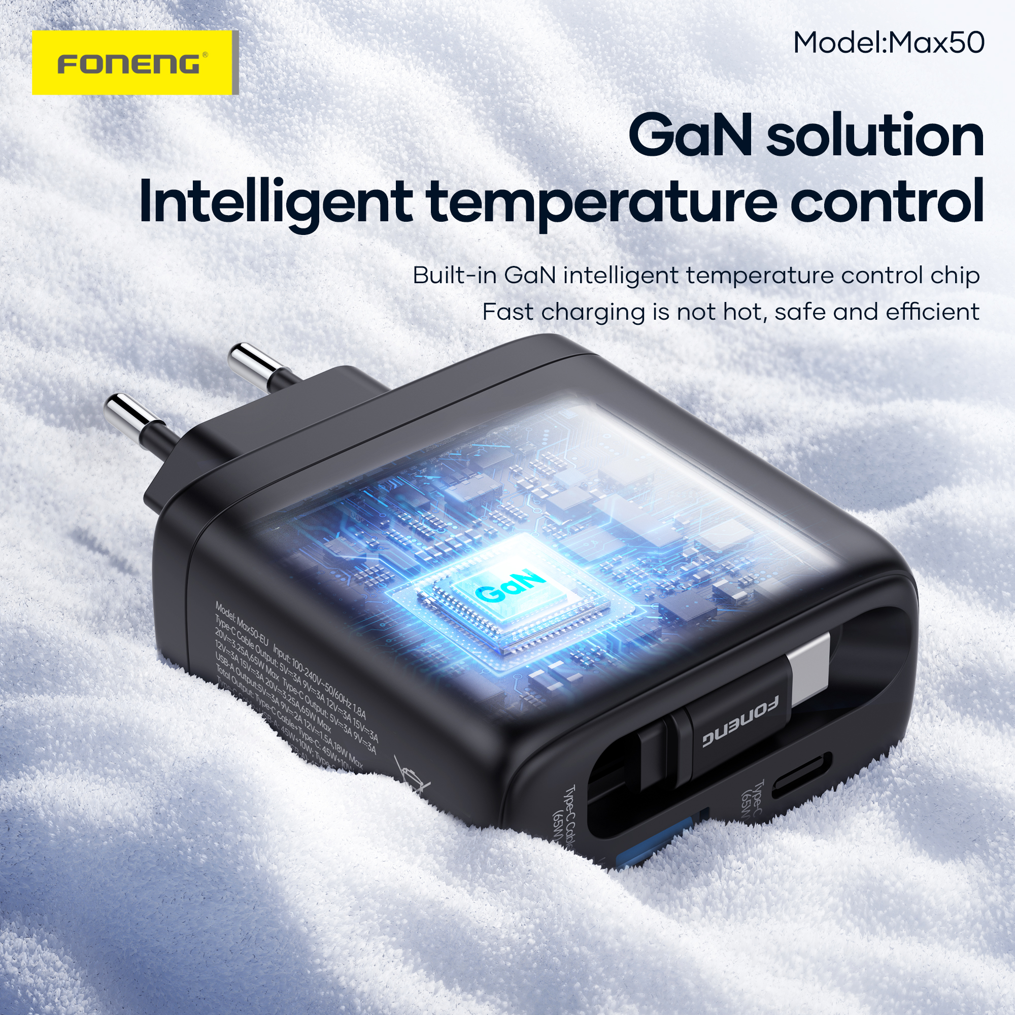 Max50-EU A+C 2-Port GaN Charger with Retractable Cable (65W)