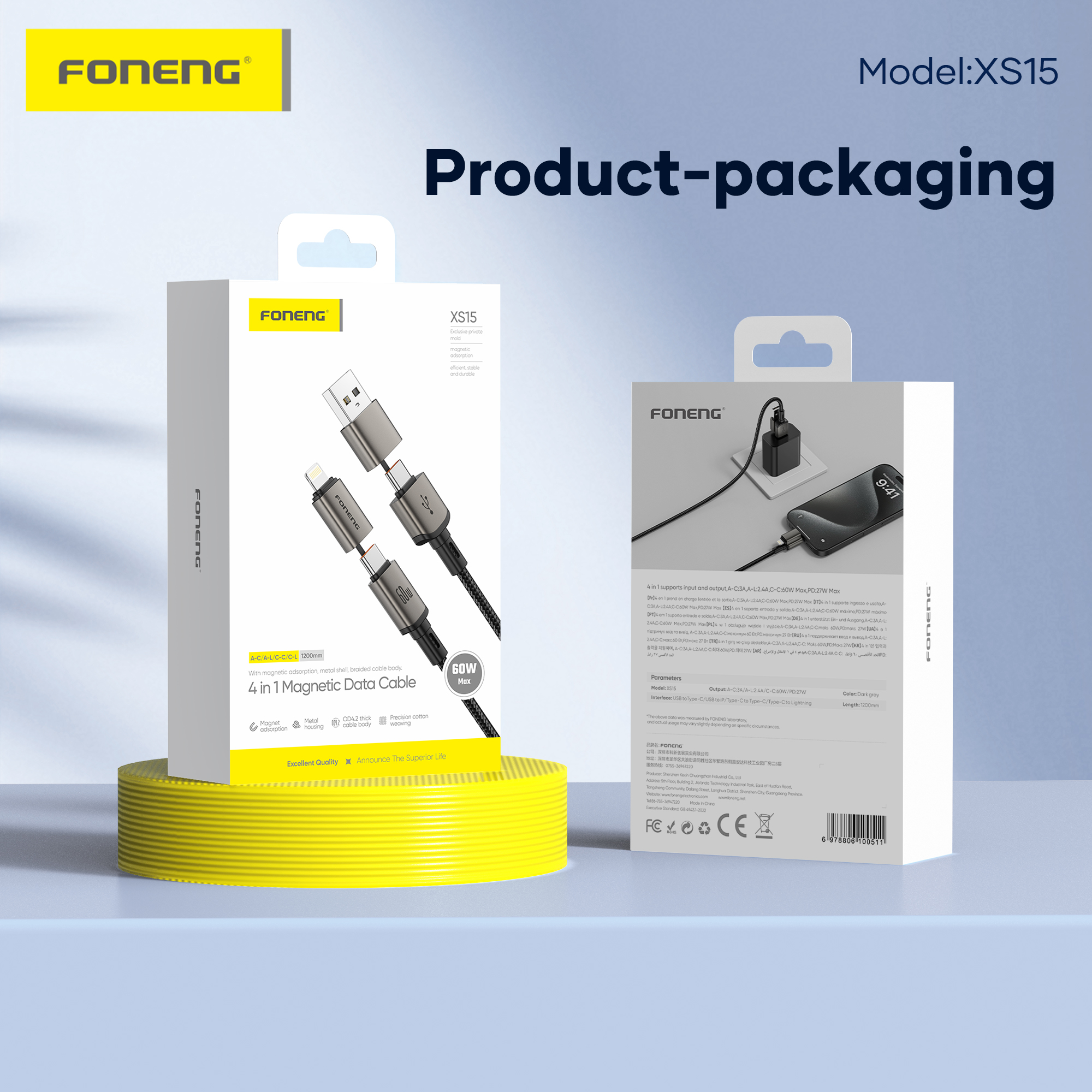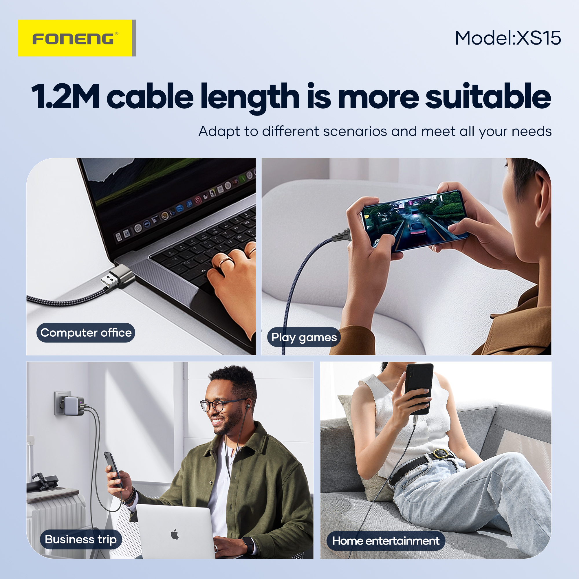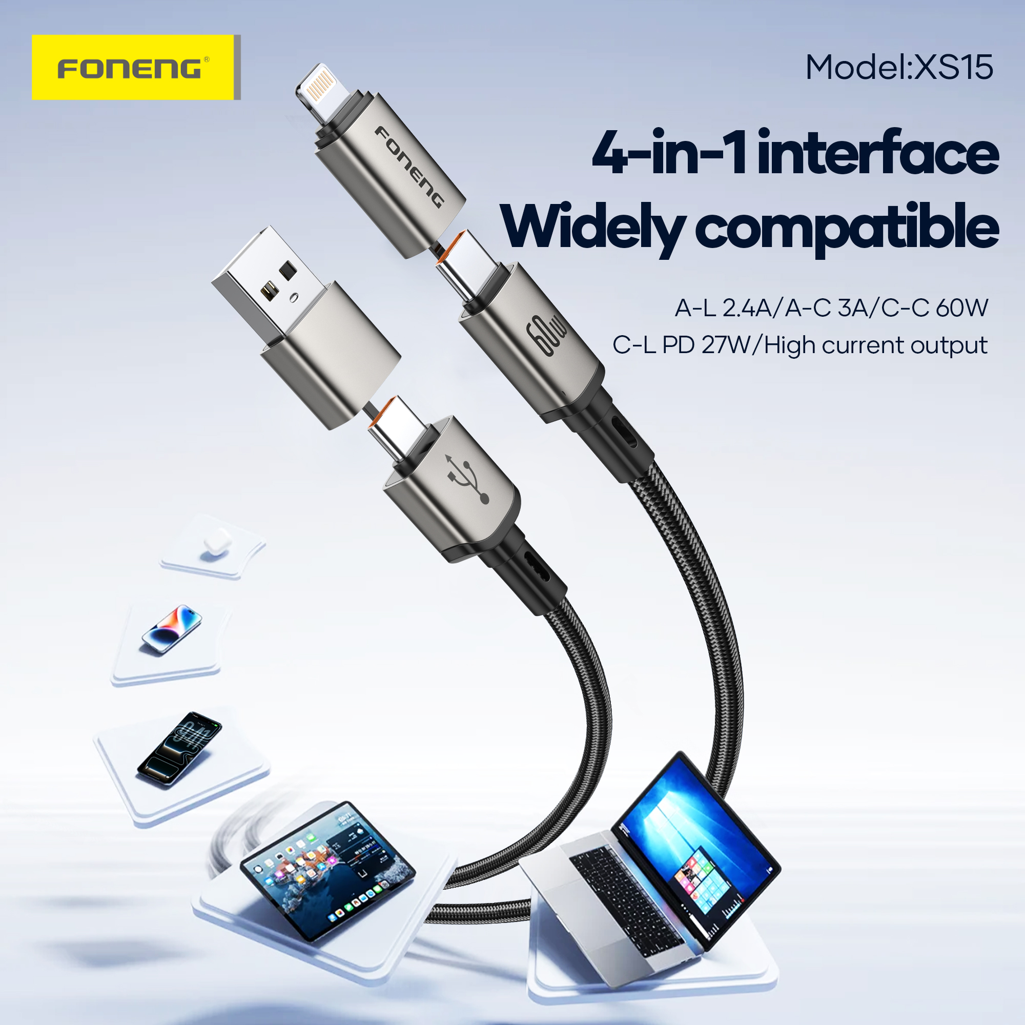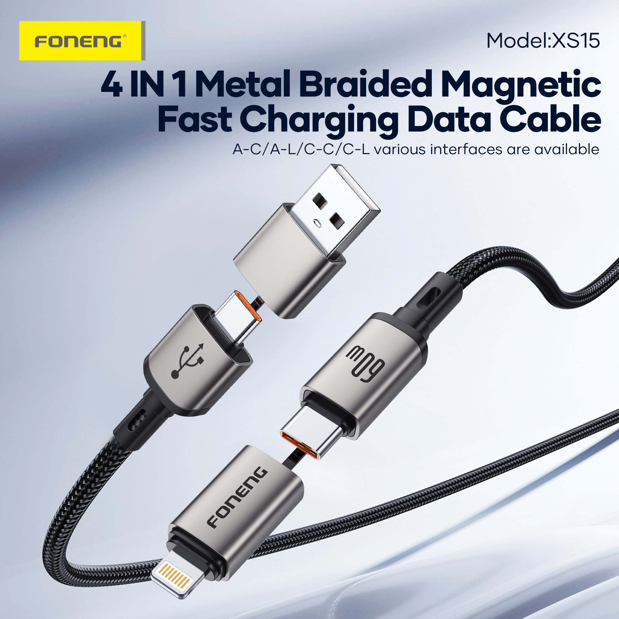 Kabloya XS15 1.2M 4-di-1ê ya bi serê metalî ve girêdayî (60W & 27W & 3A & 2.4A)