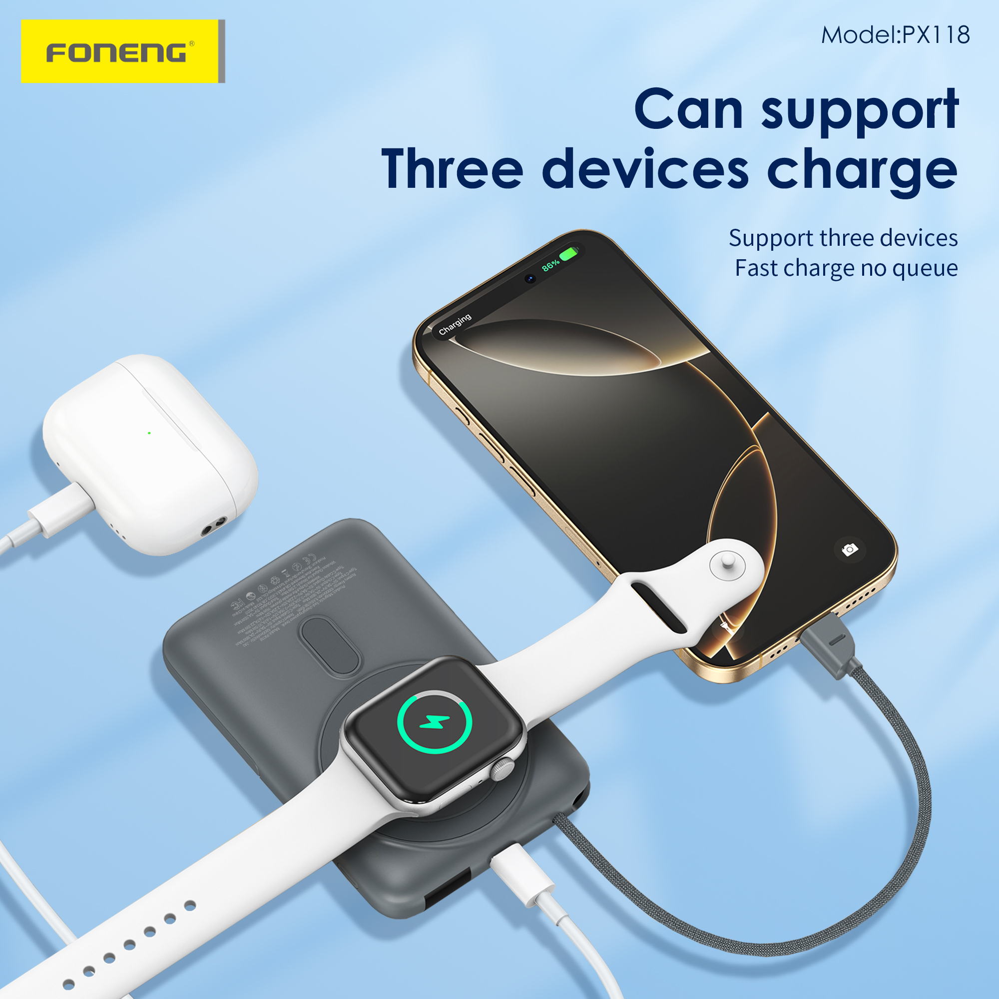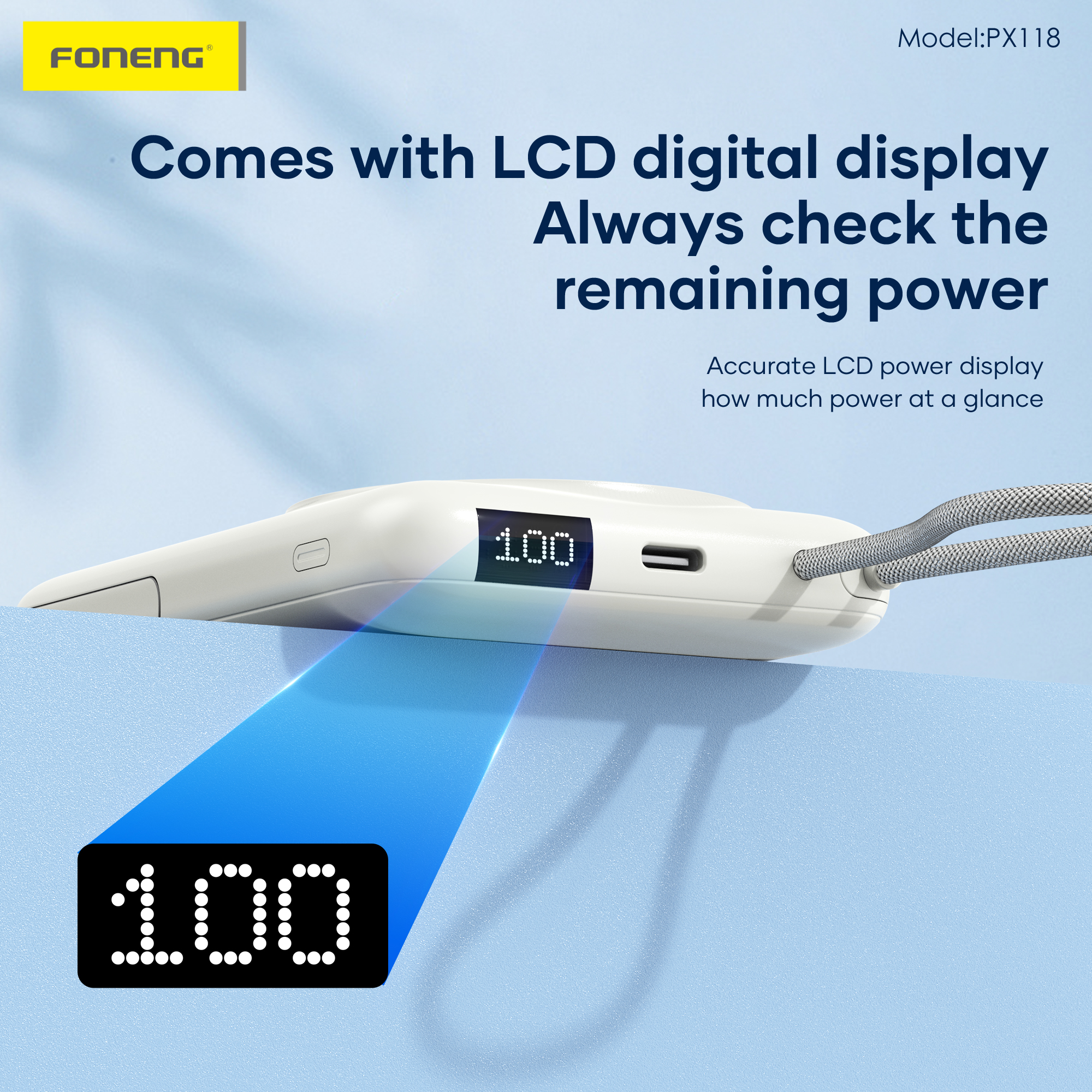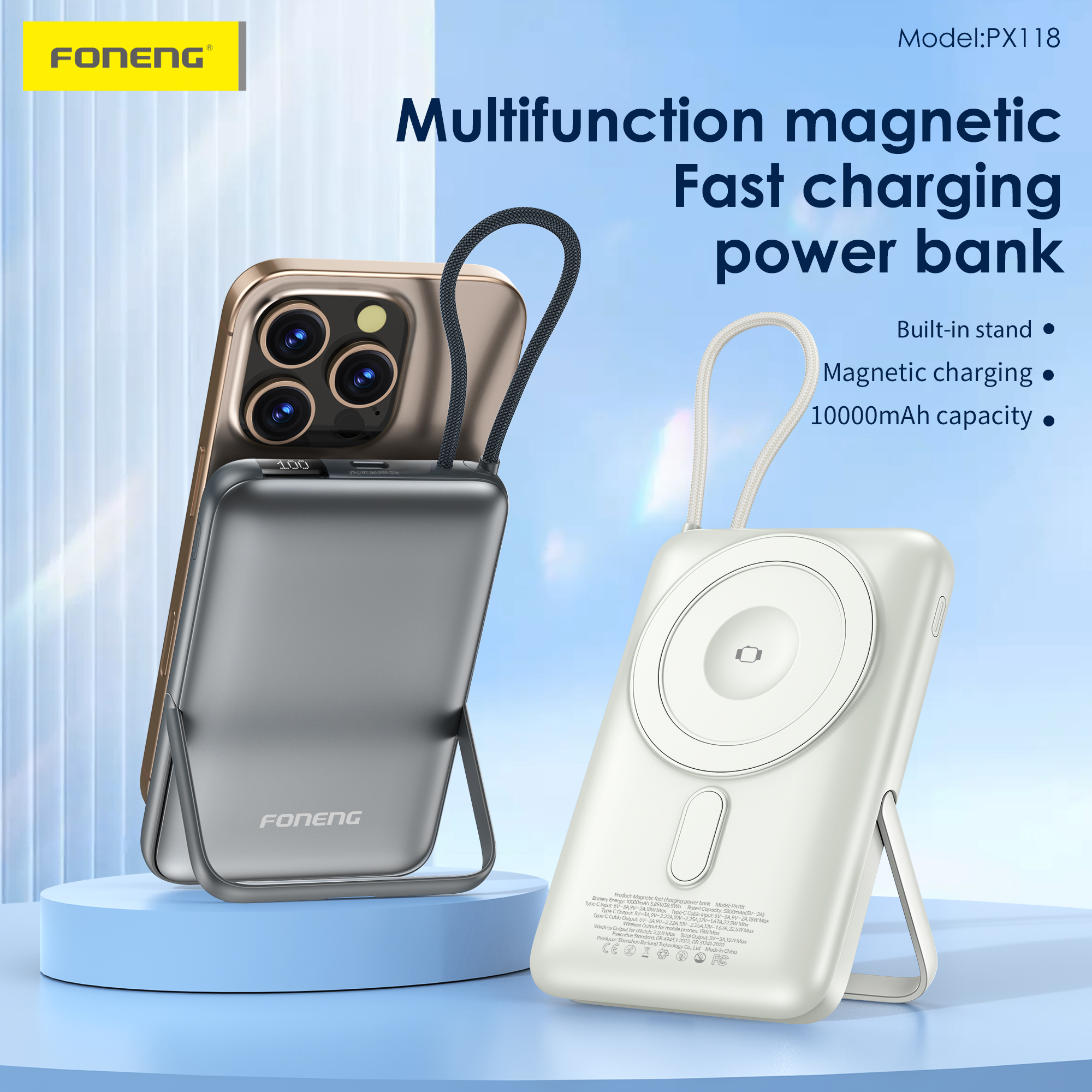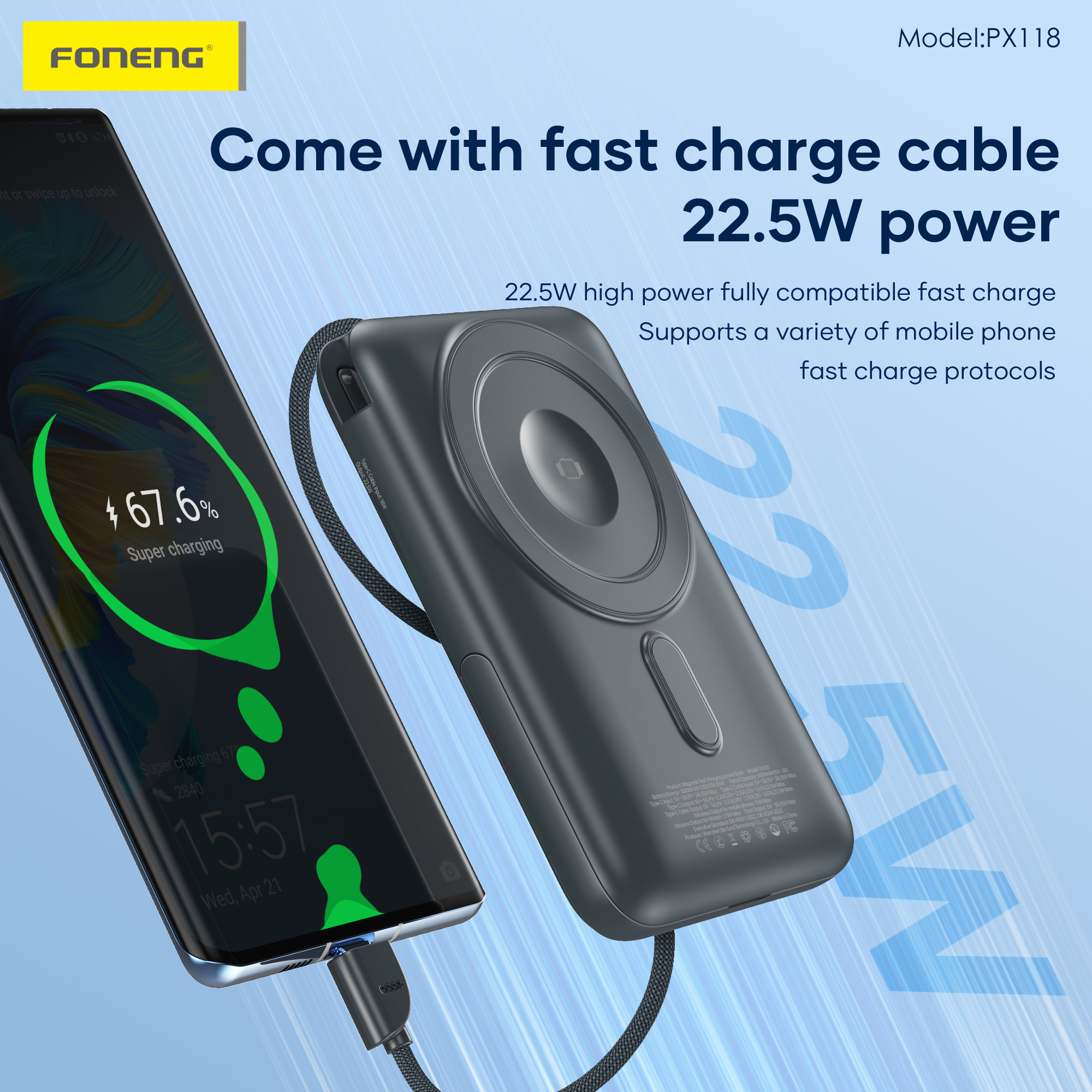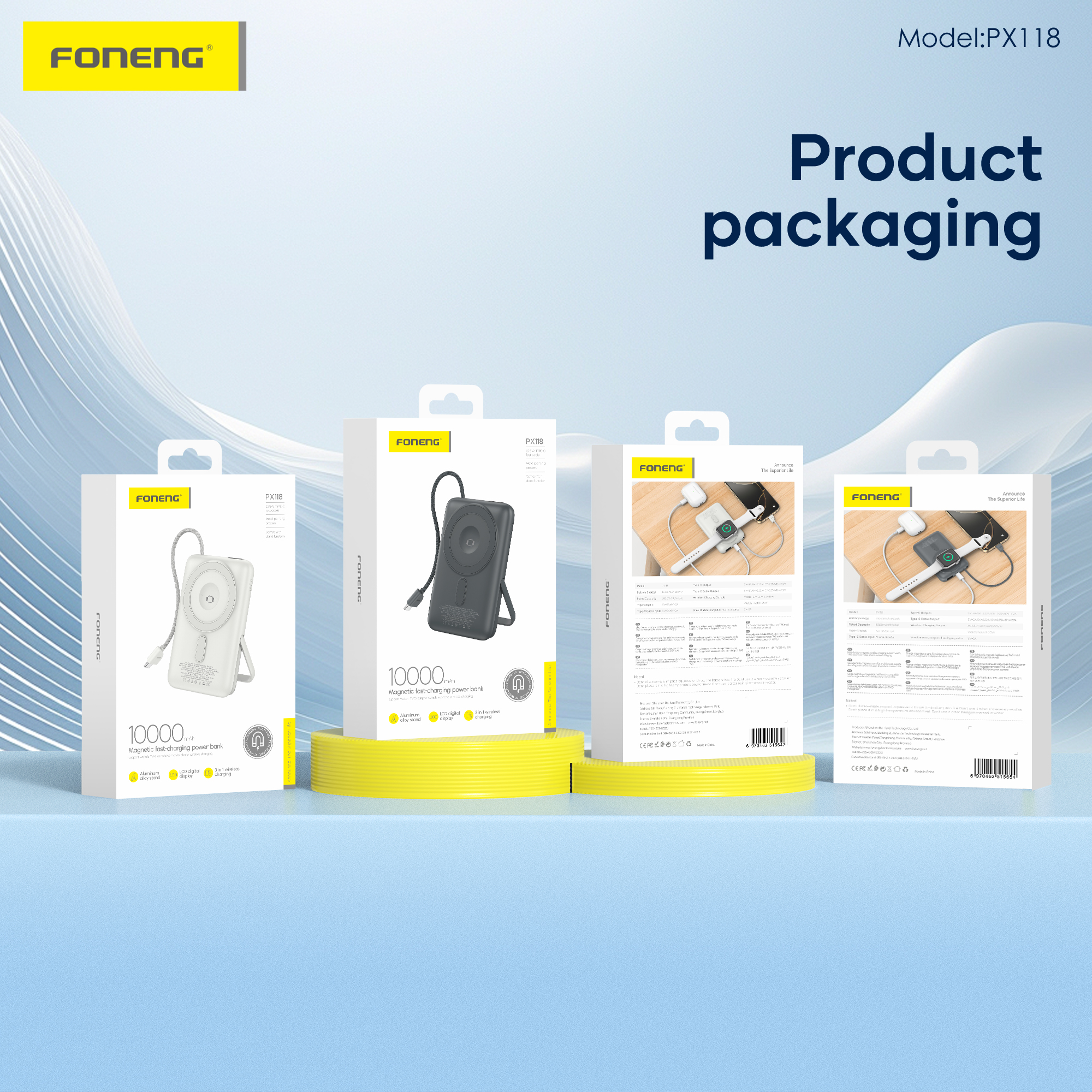 PX118 10000mAh Magnetic Wireless Power Bank oo leh Cable-lagu-dhex-yaal & Joogsi (22.5W)